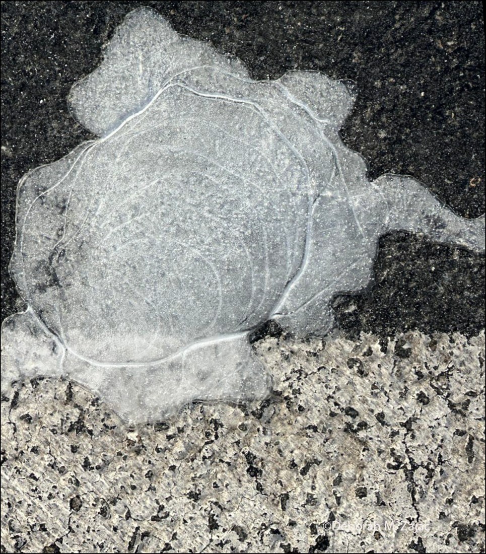 I love seeing patterns in ice. These are great photos. In the last photo, the circle at the bottom looks like a bird is standing on it.