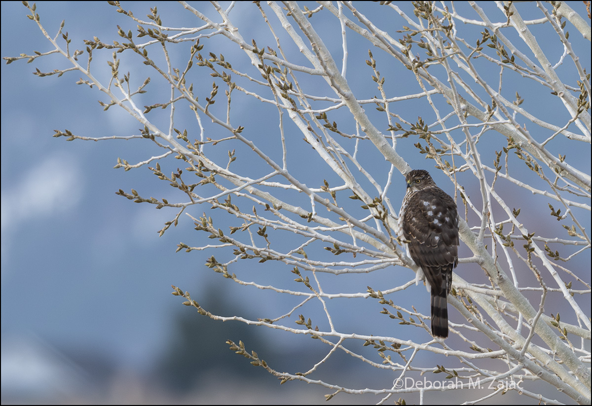 It kept coming closer then below me a Cooper’s Hawk swooped in low over the Sagebrush just behind my fence! The Sparrows and Quail all dove into the Sagebrush and got really quiet. The Hawk landed up on a branch in my neighbor’s tree. The Hawk was watching the approaching Coyote not the birds. I was watching them all.