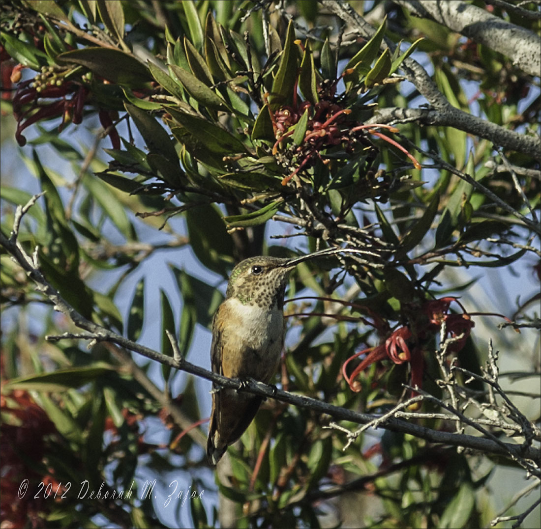 While visiting Big Baby Boy and The Dark Haired Beauty earlier this month I went out early one morning to photograph the flowers that were in bloom and saw to my delight an Allen’s Hummingbird male flitting around and landing on a Bottlebrush Bush.