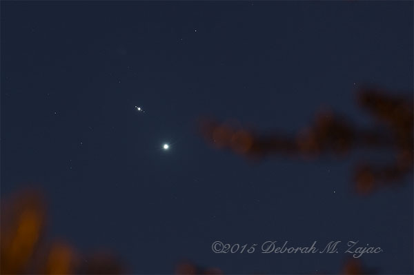 Venus and Jupiter are pretty close together tonight: just 1.1º.  Also visible with binoculars or a Telephoto lens are Jupiter’s Moons. Europa, Io, Ganymede, and Callisto.