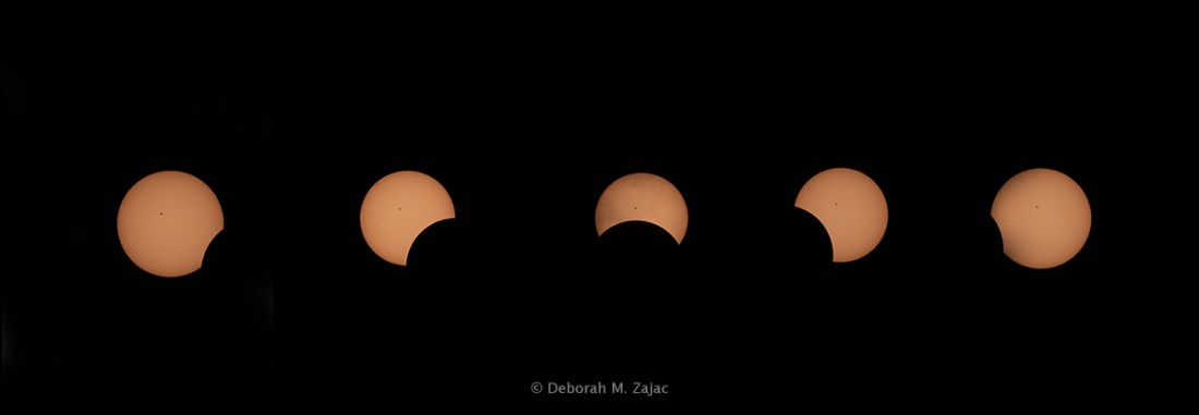 This image below is a 5 frame composite showing the sequence of the partial eclipse from shortly after the beginning to the end with the Maximum coverage image in the middle.