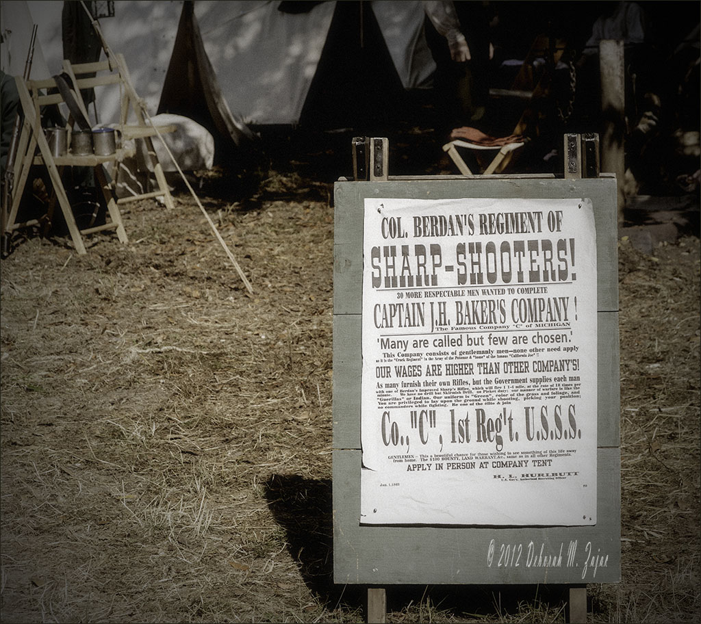 As many furnish their own Rifles, but the Government supplies each man with of Berdan’s Improved Sharp’s Rifles, while will fire 1 ¼ miles, at the rate of 18 times per minute. We have no drill but Skirmish Drill, no Picket duty; our manner of warfare is like the “Guerillas” or Indian. Our uniform is “Green”, color of the grass and foliage, and You are privileged to lay upon the ground while shooting, picking your position; no commanders while fighting. Be one of the elite & join