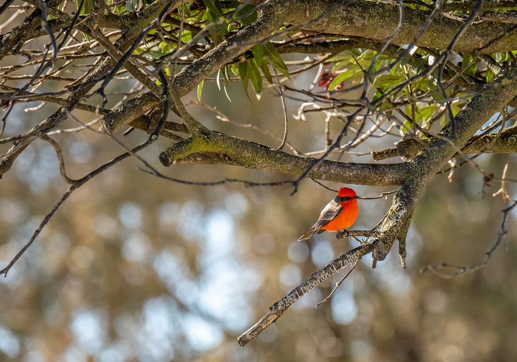 I told you I would show you the beautiful Vermilion Flycatcher that I went to see in Maxwell, CA a few week ago, and today is the day! He’s a year round resident of Mexico and South America. He does come north to So. Texas and So. California for breeding season, and has been seen in the states along the gulf coast states. How this one found his way up here in Central Calif. is a mystery, but it’s been returning for 5 winters now. He’s rare there.